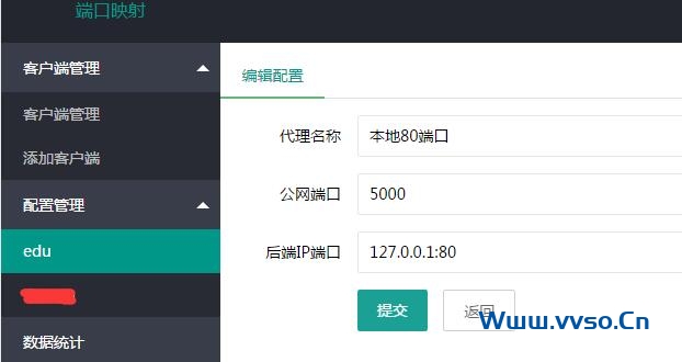 然后点击刚刚添加的客户端名称,再添加配置,设置公网端口,后端IP:端口。