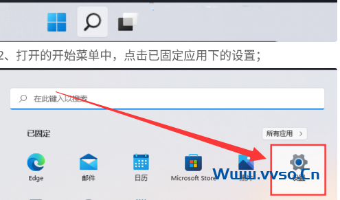 2、打开的开始菜单中,点击已固定应用下的设置;