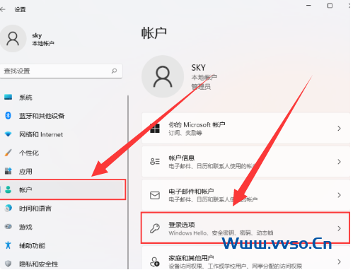 3、Windows 设置窗口,左侧边栏,点击账户,右侧点击登录选项(Windows Hello、安全密钥、密码、动态锁);