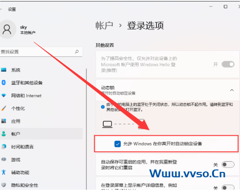 4、动态锁(离开时自动锁定设备)下,勾选允许 Windows 在你离开时自动锁定设备;