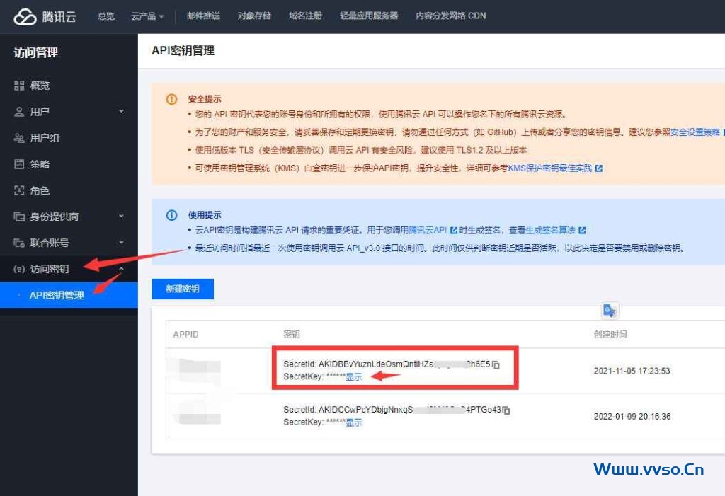 4.点击 访问密钥→API密钥管理 然后创建个新密钥 或者使用已有密钥