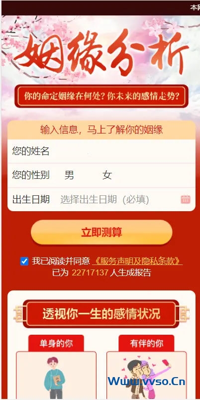 本源码为测算系统完整版,为网友提供的娱乐信息服务! 站长安装本源码后只要有人在线测算,就可以获得收入哦。 是目前市面上最火的变现利器。 本版本无后台,无数据。本版本为开发的逗号联盟接口版本。 直接对接逗号联盟,修改ID就可以直接运营收费赚钱。 2022年付费测算系统完整版/完美对接支付结算2022年付费测算系统完整版/完美对接支付结算 2022年付费测算系统完整版/完美对接支付结算2022年付费测算系统完整版/完美对接支付结算 2022年付费测算系统完整版/完美对接支付结算2022年付费测算系统完整版/完美对接支付结算 赞微海报分享