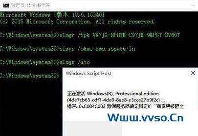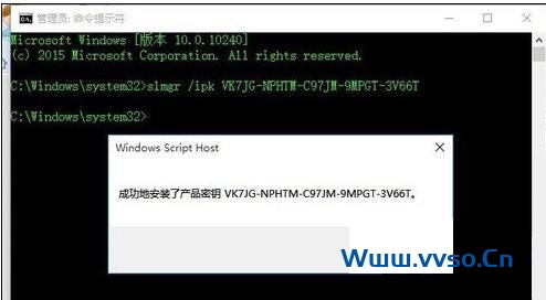 从打开的“命令提示符”窗口中,依次输入以下命令,以激活Windows 10专业版系统: