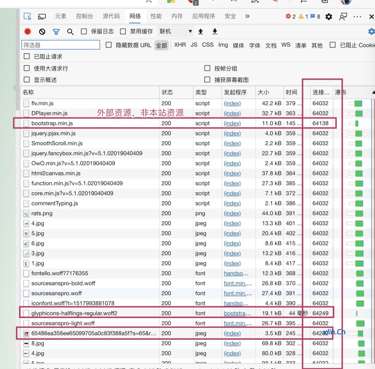 在chrome控制面板中可以看到当前网站建立的tcp连接的id,使用http2后,除了外部资源,本站资源的请求只建立一个tcp链接。
