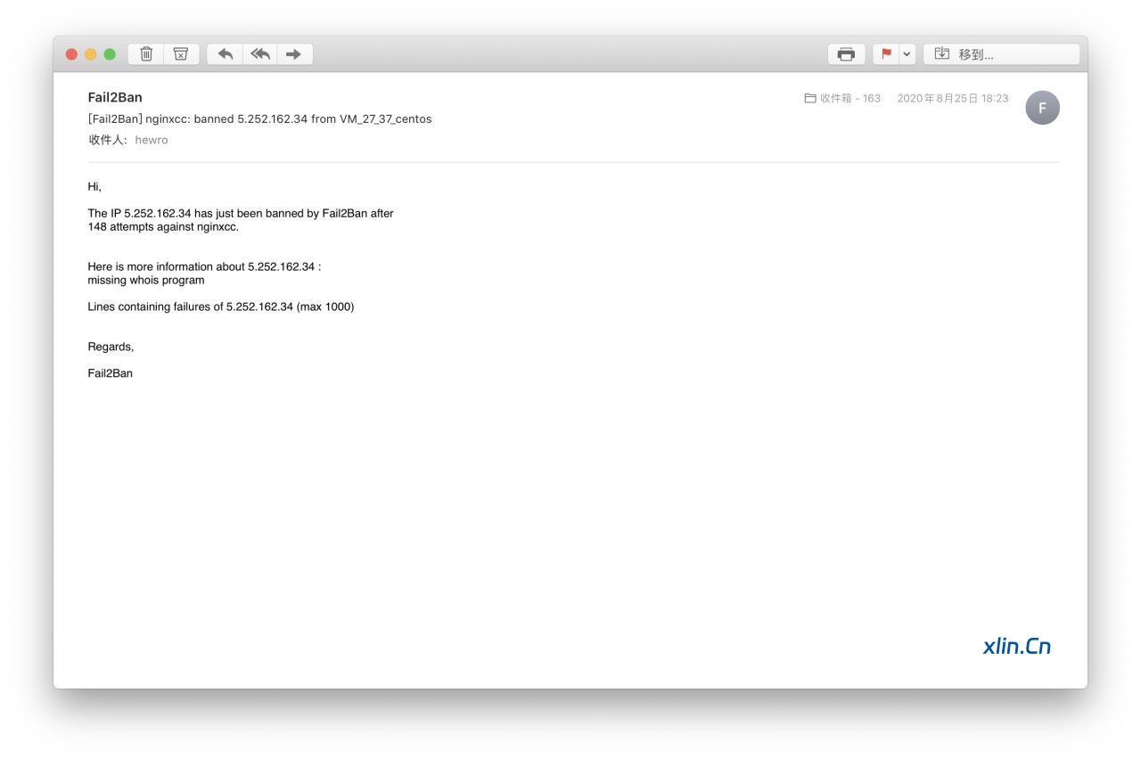 除此之外,你也许注意到了action中还有一个sendmail的配置。配置了该项后,当该监狱启用、停止或者ban某个ip的时候,都会给你的dest邮箱地址发送一个邮件。前提是你的服务器配置好了sendemail模块。