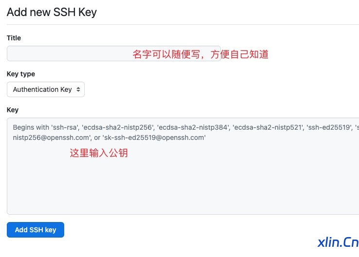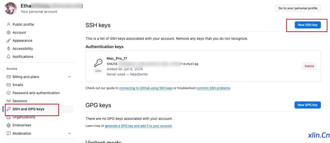在 GitHub 上,找到个人设置里面,找到 SSH 和 GPG,点击添加新的 SSH Key: