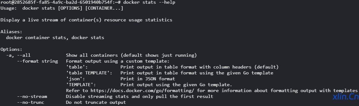 执行后会显示docker stats的参数、用法示例,遇到不懂的命令,这招总能帮上忙。