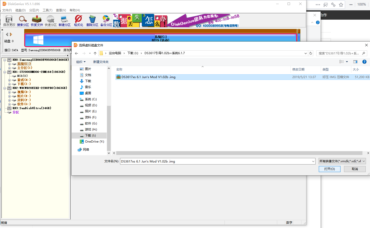 打开 DiskGenius,选择 磁盘——打开虚拟磁盘文件,选择之前下载的 img 文件。