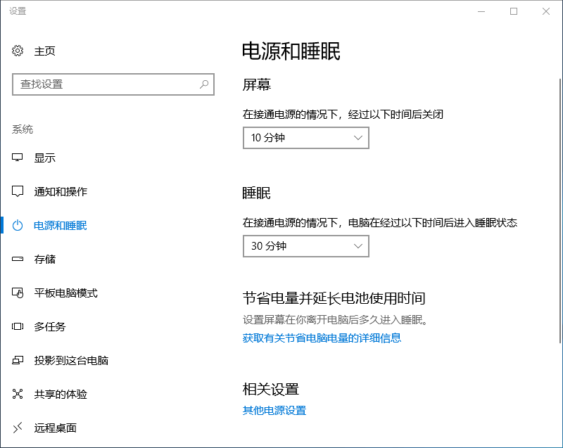 如果是一台新装的 Windows 10 操作系统,那么它默认是 10 分钟后熄屏省电。而需要你动鼠标、键盘去唤醒;30 分钟之后,主机、硬盘会进入休眠状态,这时候你需要在主机上再按下开机键才能唤醒。这个功能能有效的节约用电,但是如果你不需要,那么久请设置一下它!