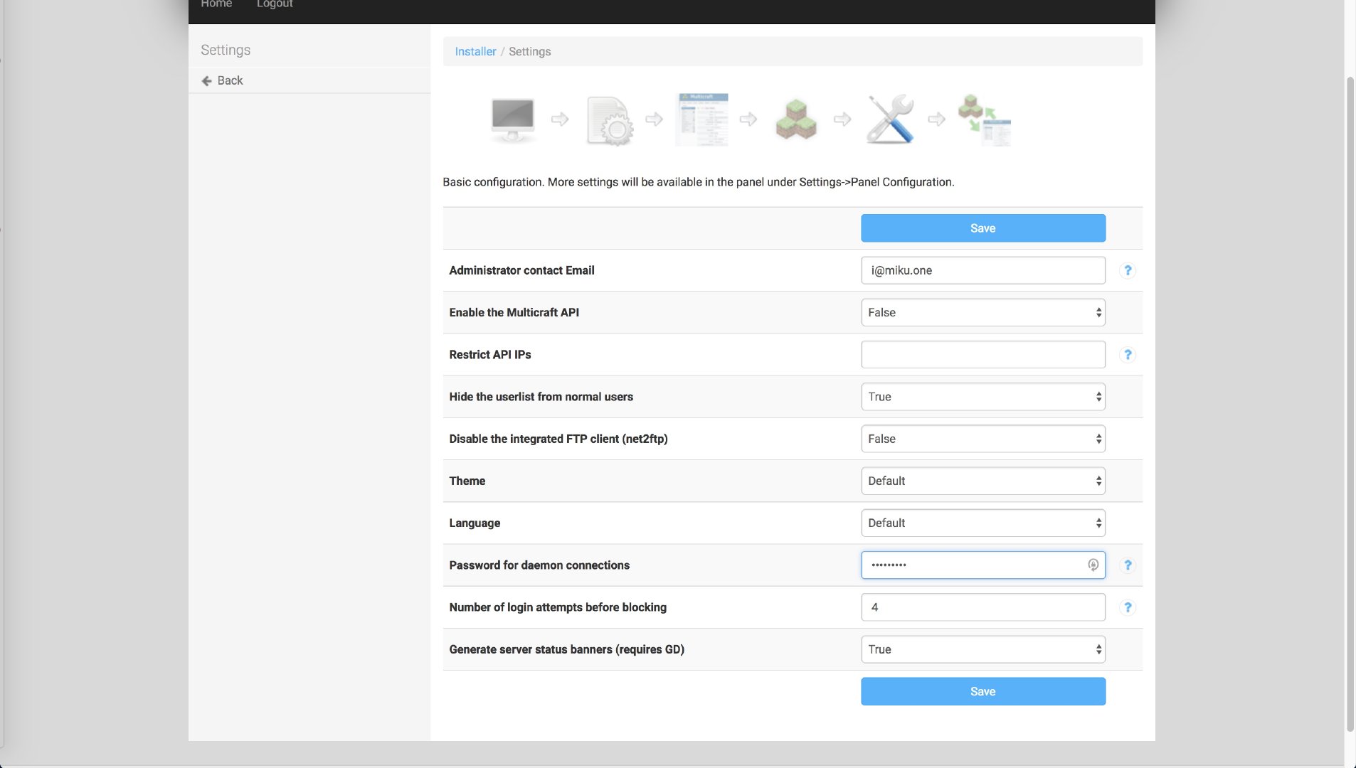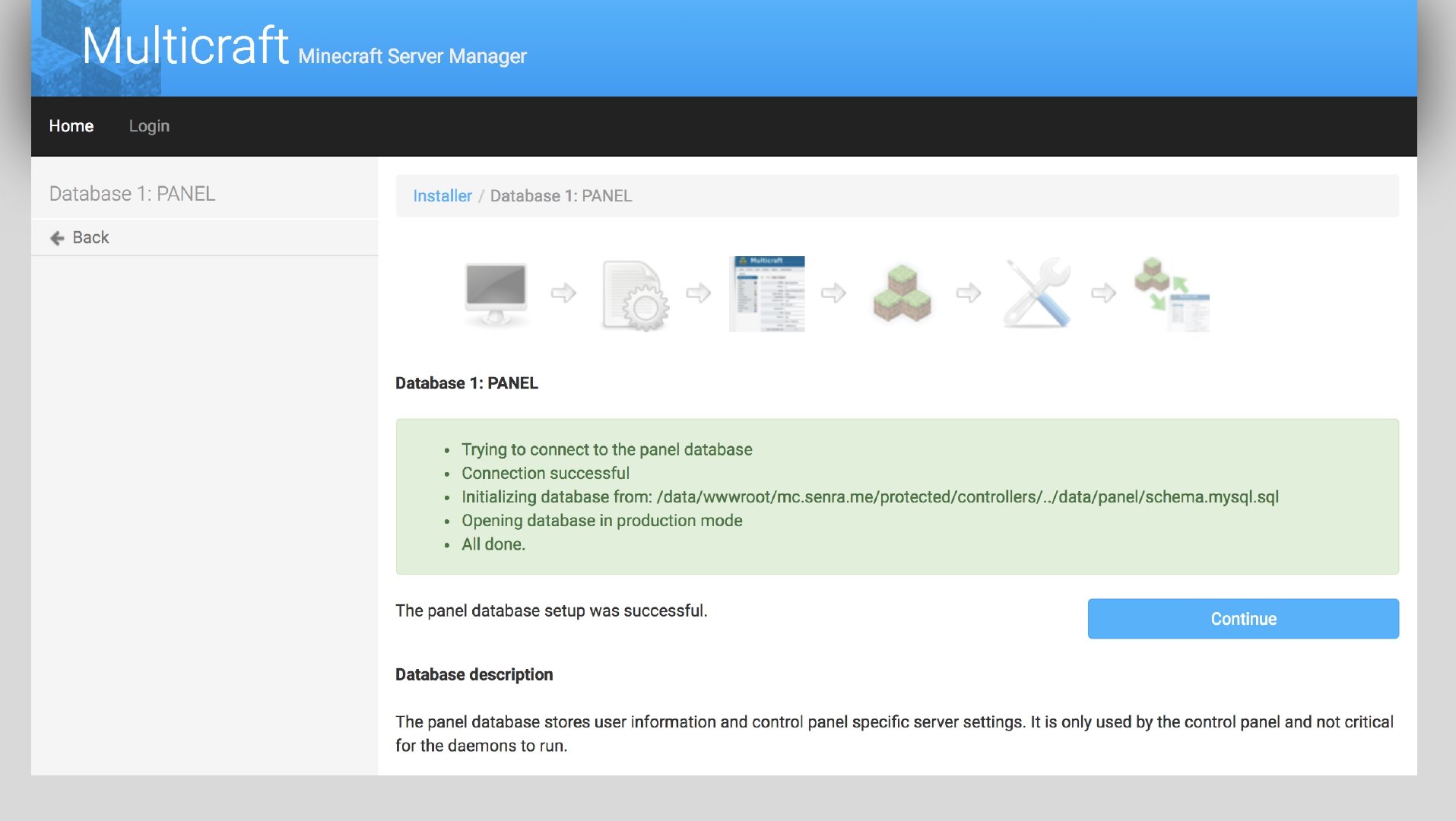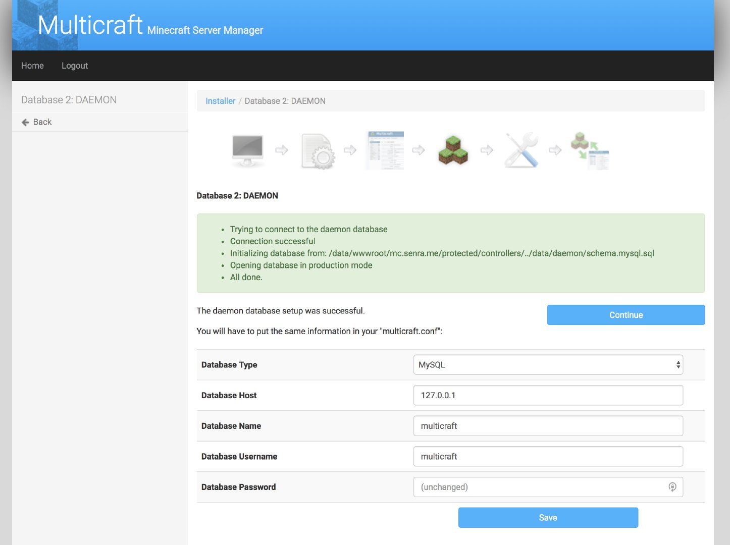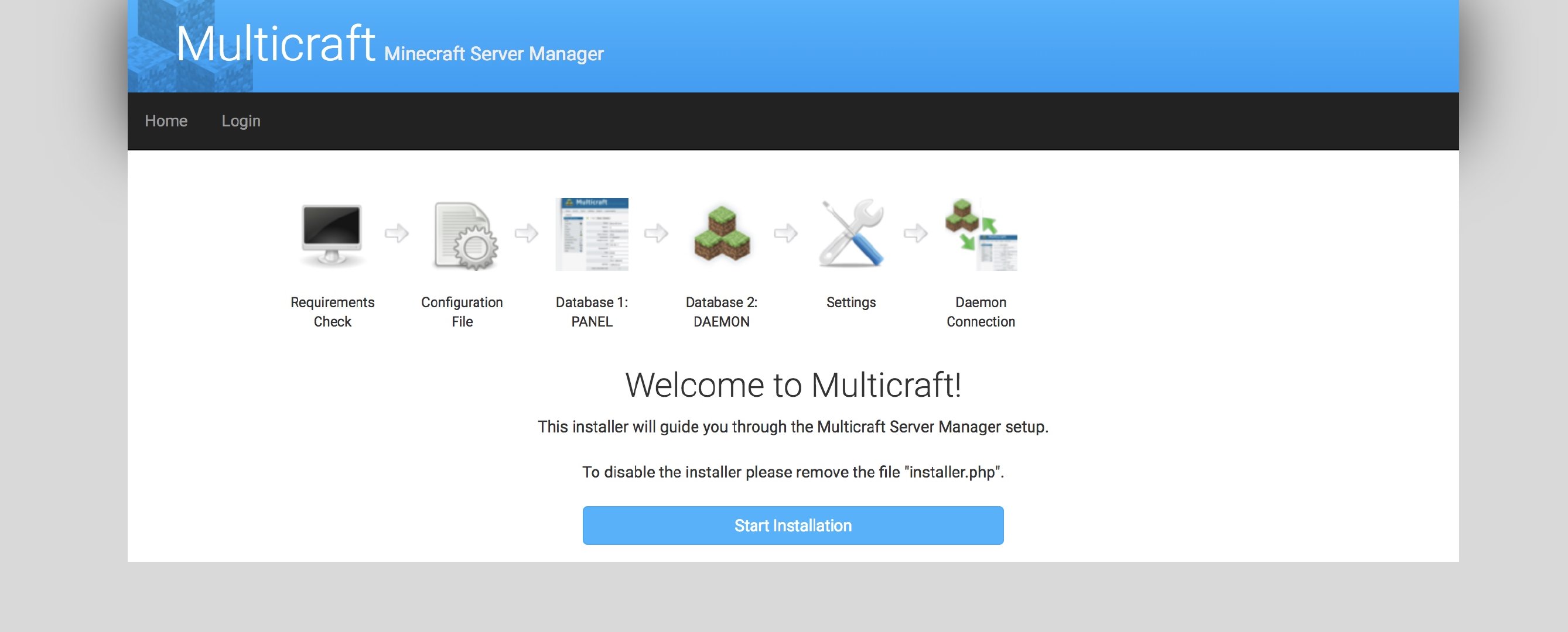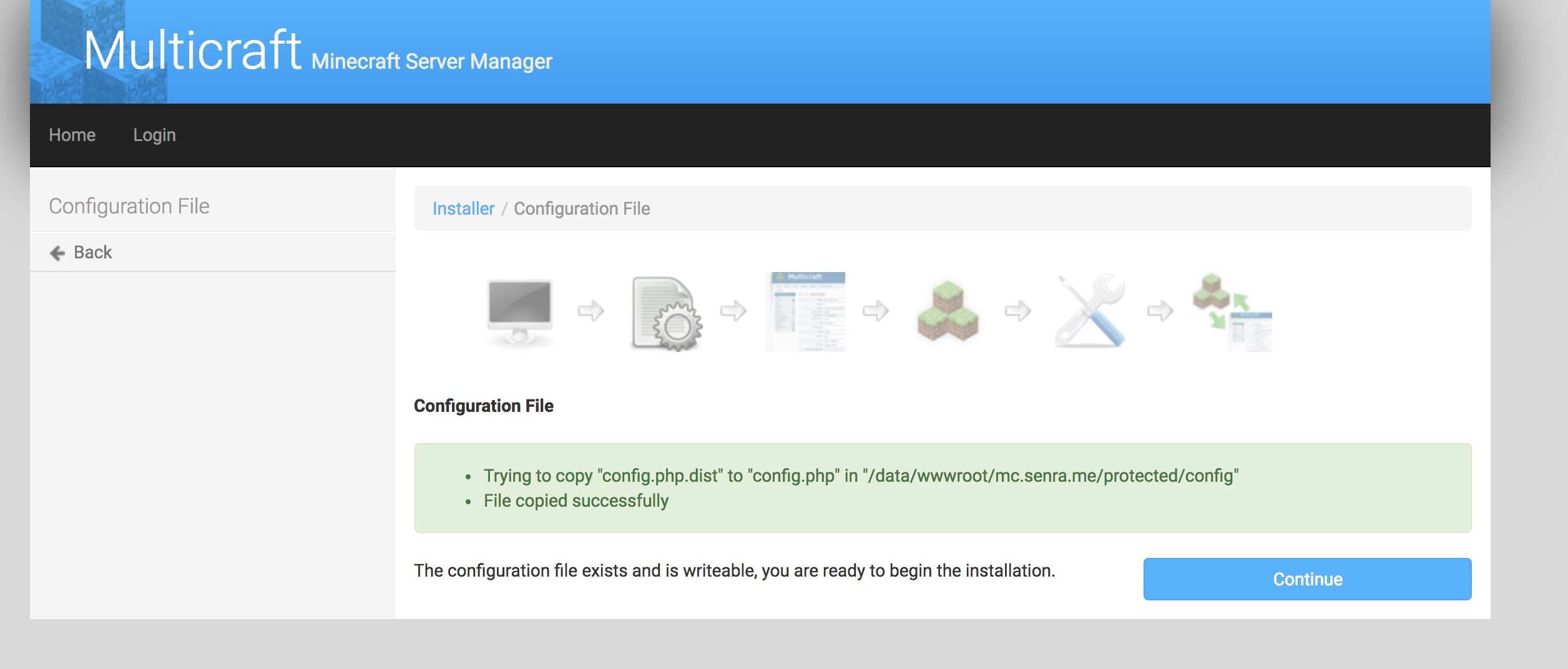 #前往网站 vhost 根目录 cd /path/to/vhost/root #下载上面的包来获得面板程序 wget http://www.multicraft.org/download/linux64 -O multicraft.tar.gz tar xzf multicraft.tar.gz #把面板程序移动到网站根目录 mv multicraft/panel/* . mv multicraft/panel/.htaccess . #清理一下 rm –rf multicraft multicraft.tar.gz #修改所有者 chown –R www:www *