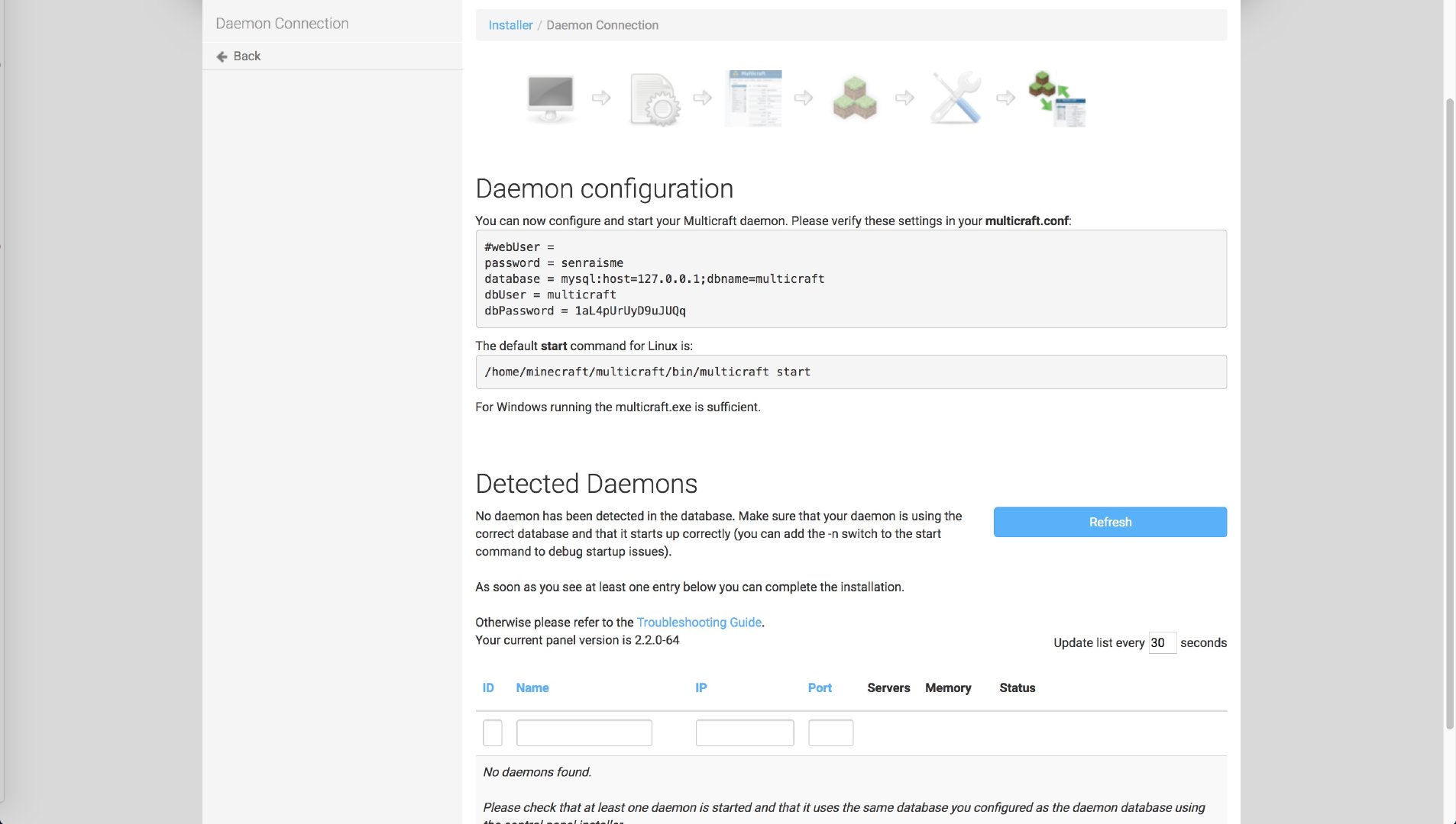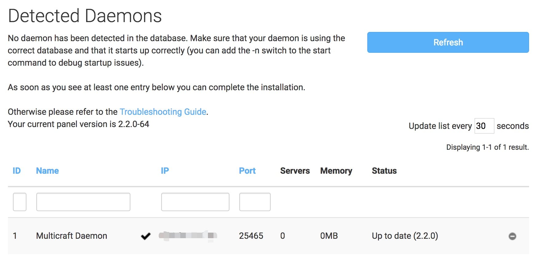 然后稍等一会儿就会看到你的 Daemon 了,如果一直没有请确认你之前安装生成的 Daemon 那儿的 multicraft.conf 和网页上面显示的是不是一样(当然 IP 那边肯定不一样)