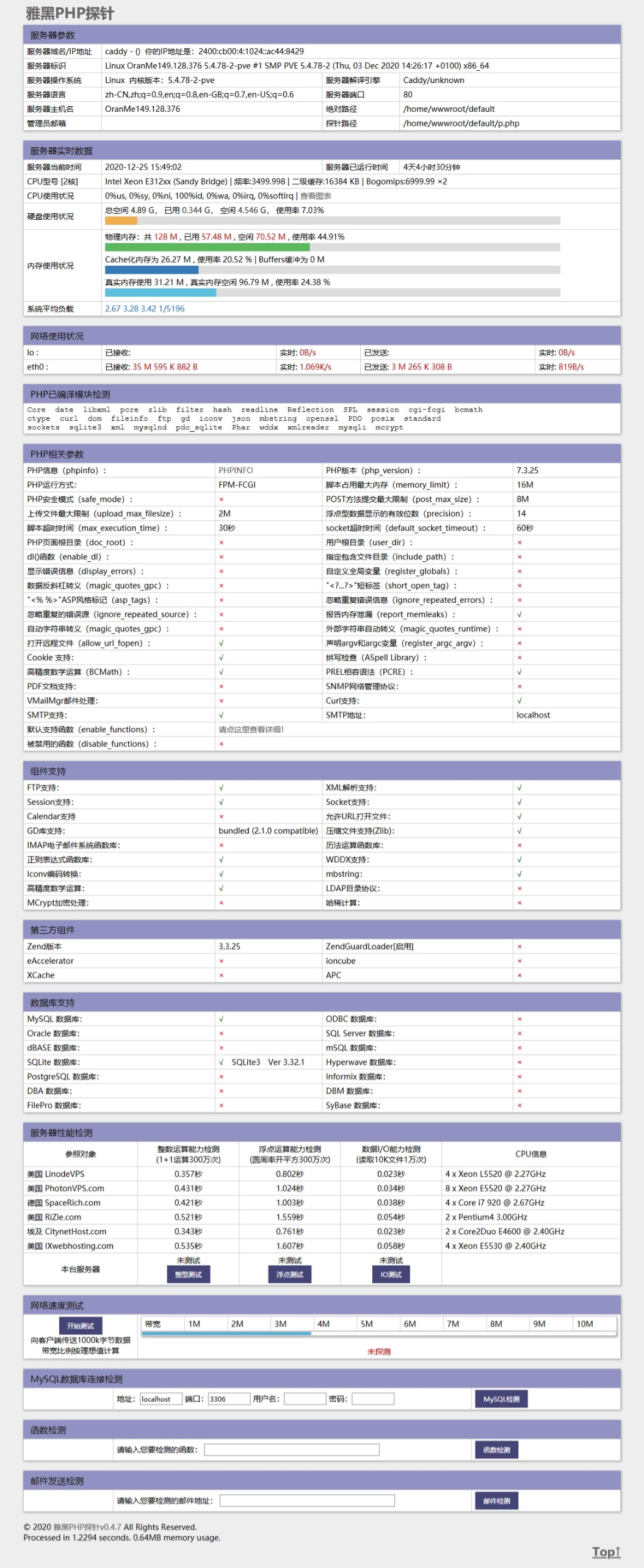 搭建好了之后,硬盘占用不会超过500M,还是比较迷你的,1G硬盘的小鸡还可以有剩余,而且PHP是7