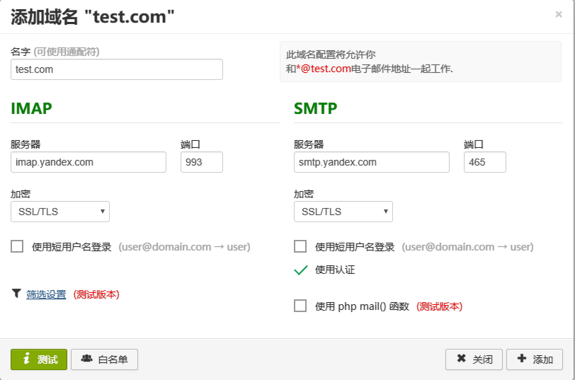 最后在域名里面新加你添加域名,填写Yandex验证过的域名、IMAP、SMTP。