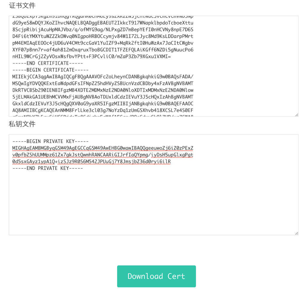 第一个框内的是证书(包含中间证书),第二个框内的是私钥。你可以方便的复制,或点击下载打包成一个 zip 文件。