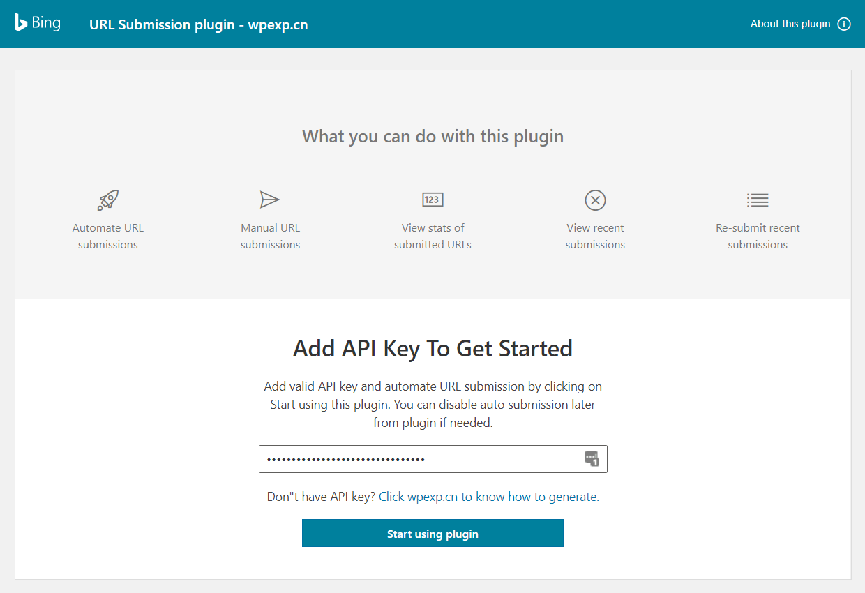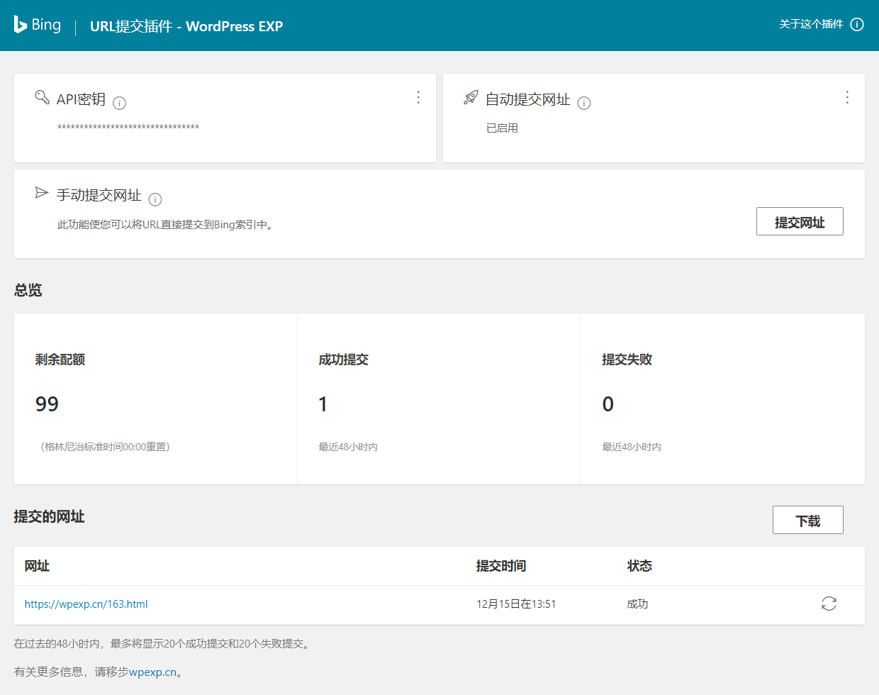 - Bing URL Submissions Plugin 插件地址:https://wordpress.org/plugins/bing-webmaster-tools/