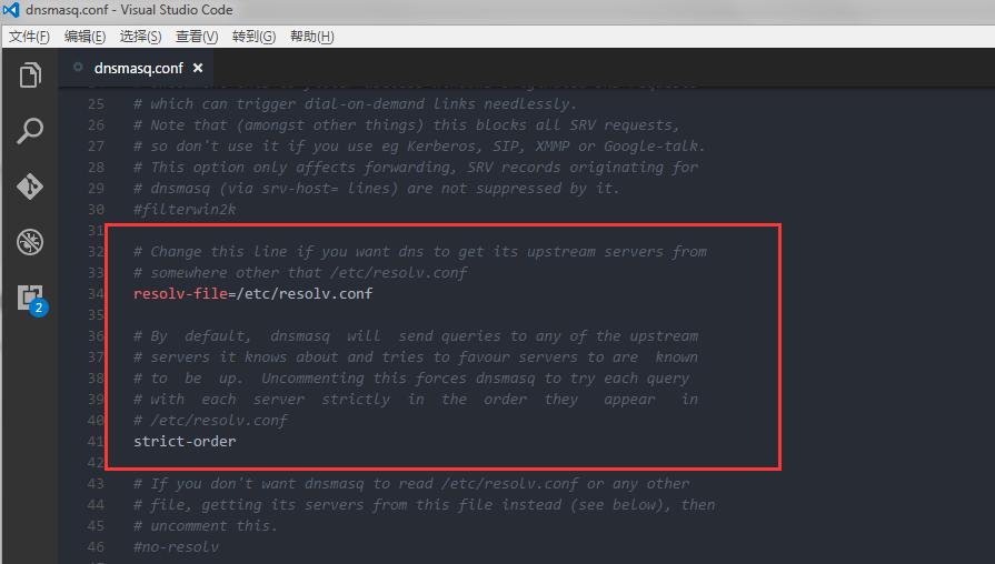 需要注意的一点是,检查一下no-hosts前面是不是已经有了#号,默认的情况下是有的,dnsmasq 会首先寻找本地的 hosts 文件再去寻找缓存下来的域名, 最后去上游dns 服务器寻找。