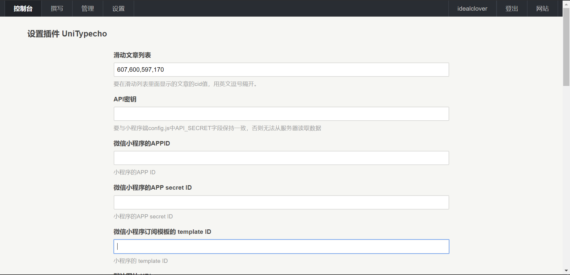 将项目目录下的 UniTypecho-Plugin 文件夹上传至 Typecho 目录 /usr/plugins 目录下,并 重命名 为 UniTypecho, 注意大小写,否则可能不能使用 ; 进入 Typecho 后台插件管理 控制台 -> 插件,启用 UniTypecho 插件,然后进入设置,配置 API 密钥、APPID、APPSecret 等: