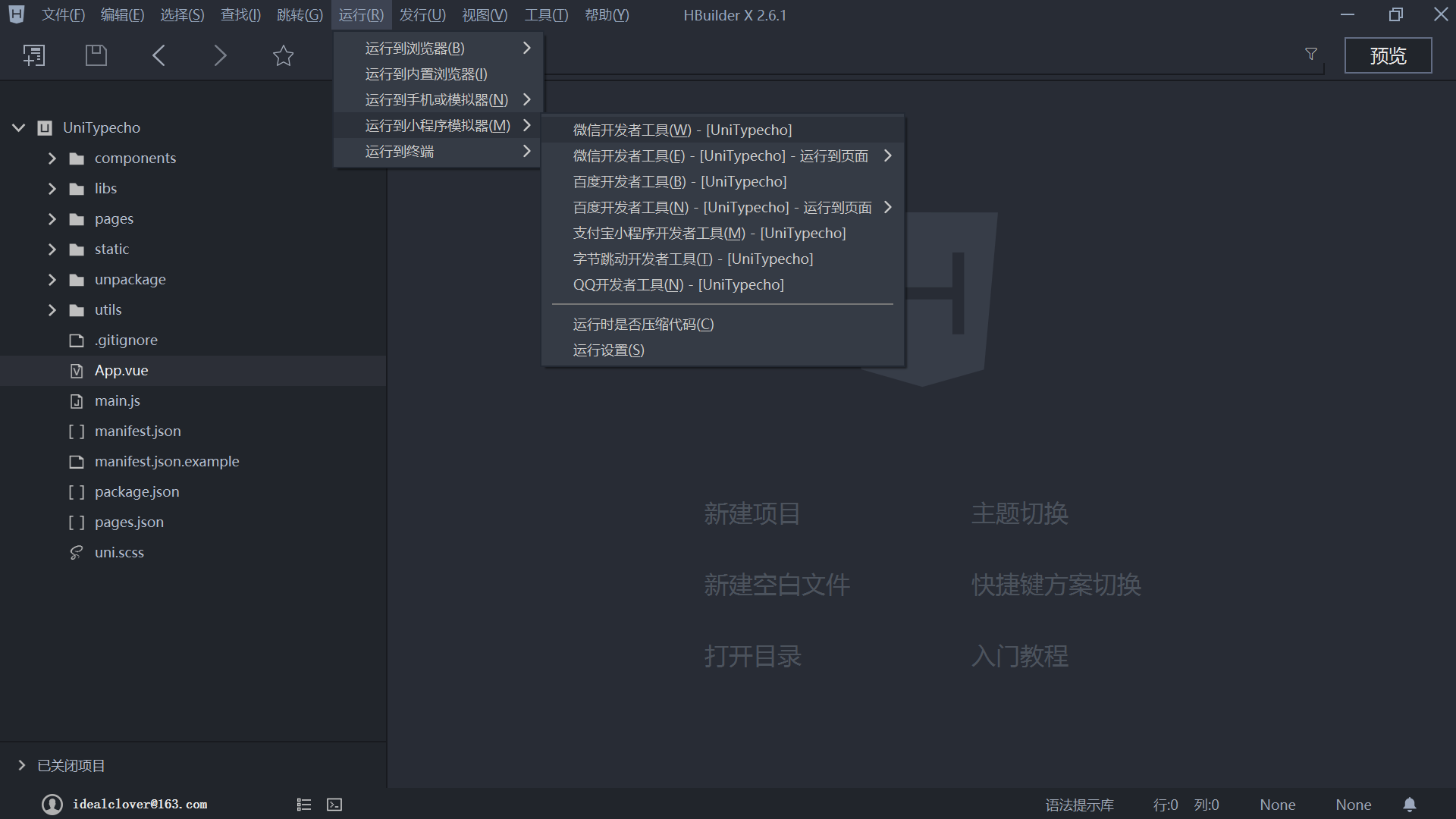 调试:运行 - 运行到小程序模拟器 - 微信开发者工具,如果运行顺利,会自动打开微信小程序开发工具并打开项目;若未打开项目,项目目录为 目录 /unpackage/dev